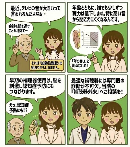 加齢により多かれ少なかれ聞こえが悪くなってきます。聴力検査では高い周波数の音から聞こえが悪くなってくる場合が多いです。