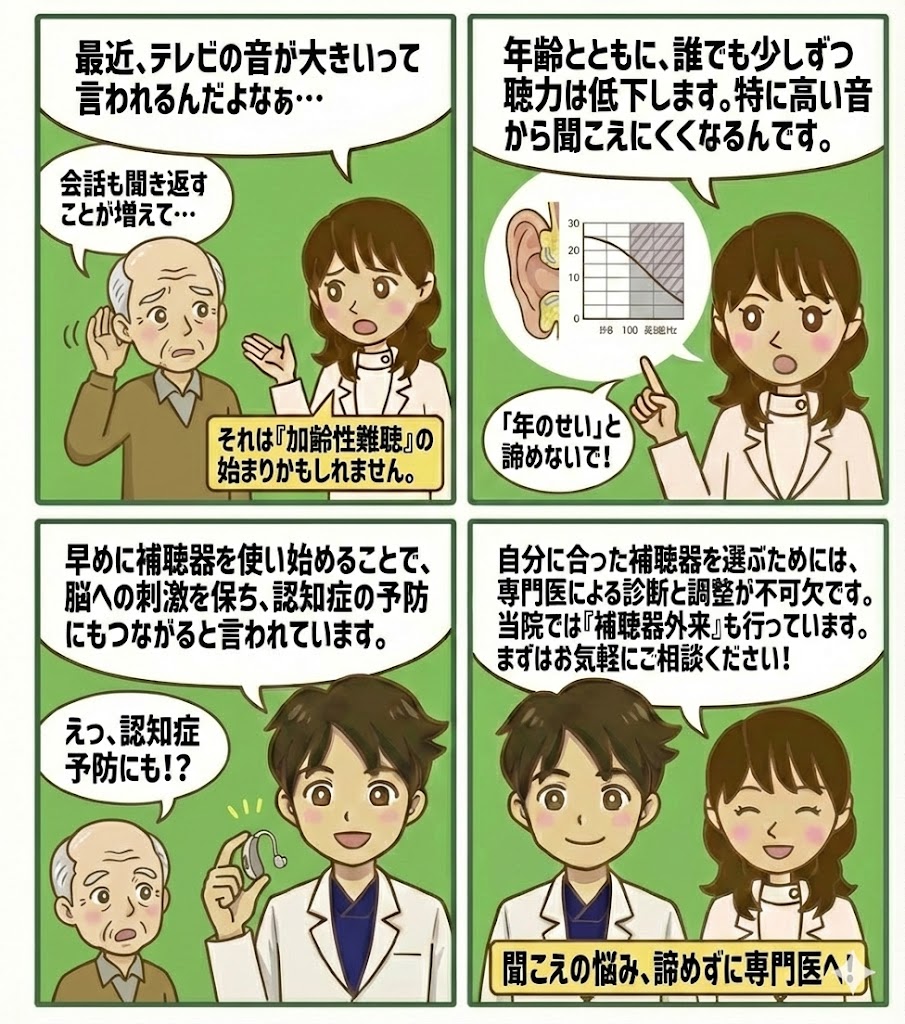 加齢により多かれ少なかれ聞こえが悪くなってきます。聴力検査では高い周波数の音から聞こえが悪くなってくる場合が多いです。
